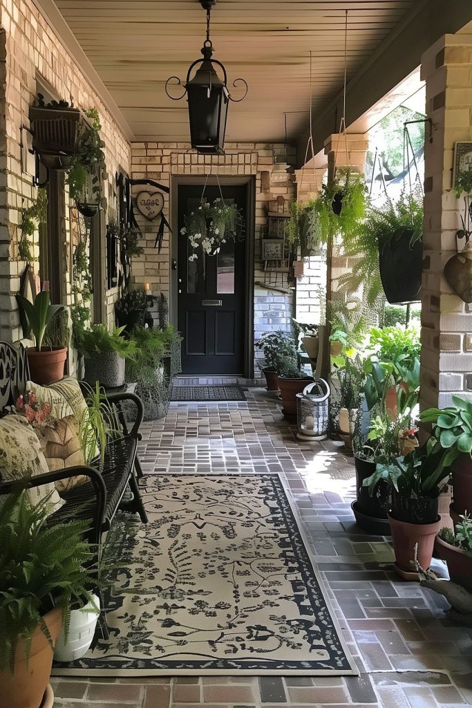 Elevate your long front porch with an outdoor rug, adding warmth and definition to the space. Choose a durable rug in a stylish pattern or color to complement your porch decor.