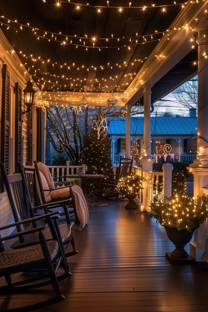 Transform your long front porch into a magical oasis with string lights, casting a warm glow in the evenings. Hang lights along the railing or ceiling to create a cozy ambiance.