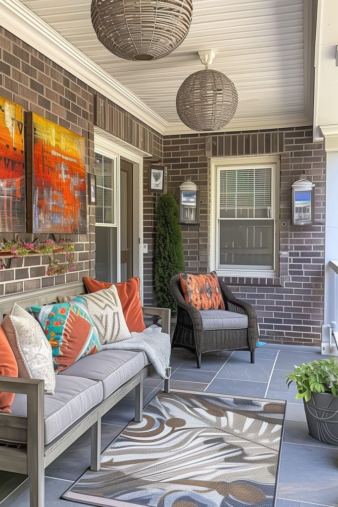 Elevate your long front porch with outdoor art, adding personality and visual interest to your space. Choose weather-resistant sculptures or wall hangings to withstand outdoor elements.