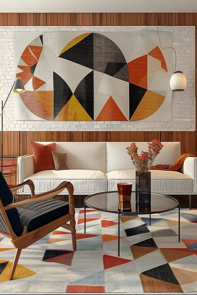 Incorporate geometric patterns into your living room design through area rugs, throw blankets, or wallpaper to add visual interest and depth to the space.