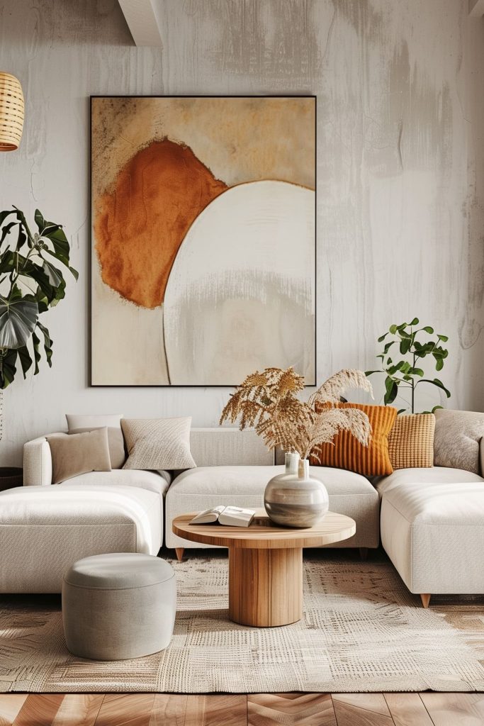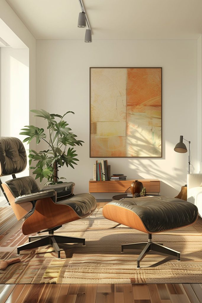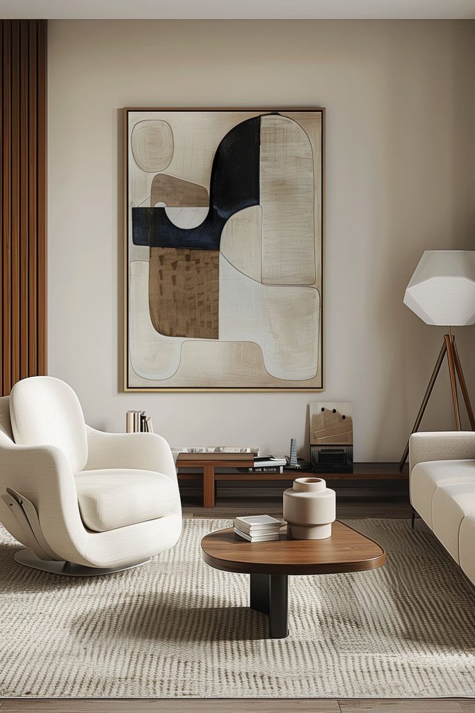 Elevate your midcentury modern living room with minimalist artwork that complements the clean lines and simplicity of the design aesthetic.
