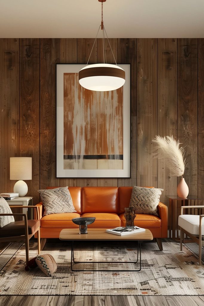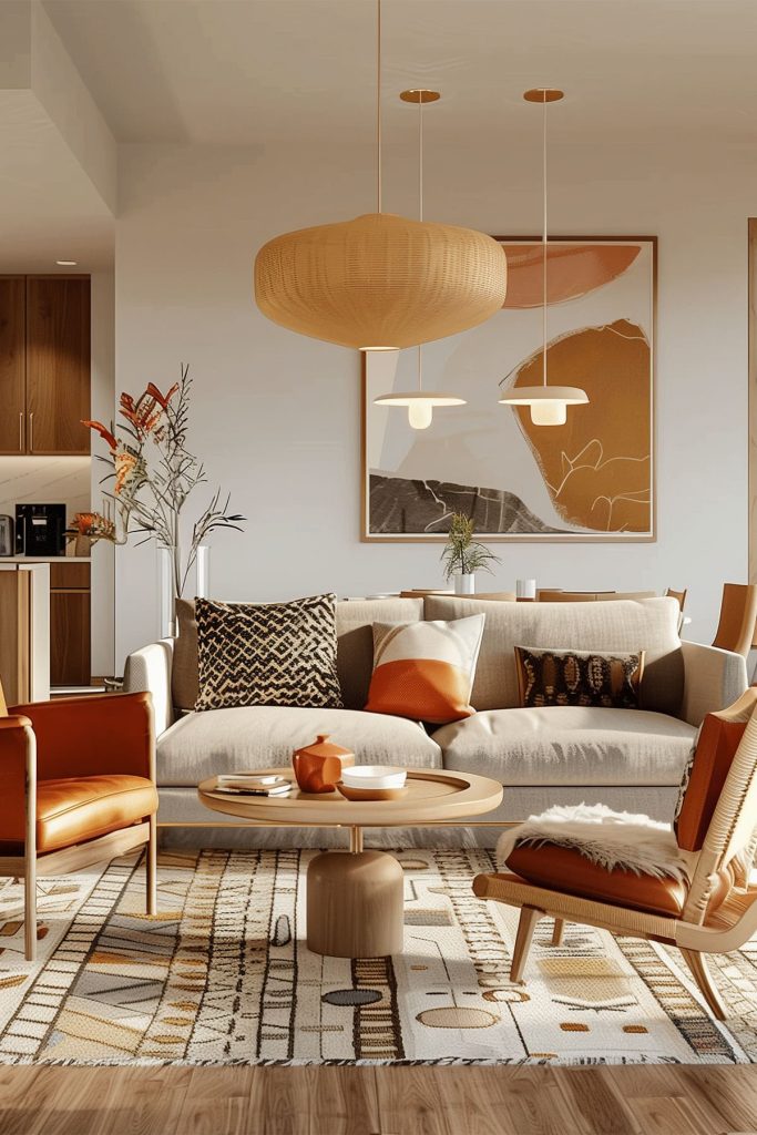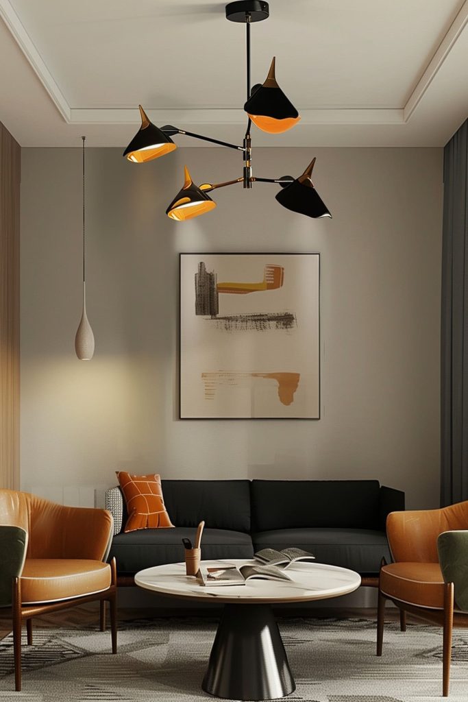 Illuminate your midcentury modern living room with statement lighting that adds both style and functionality.