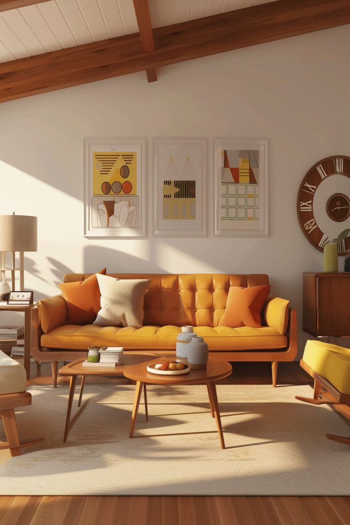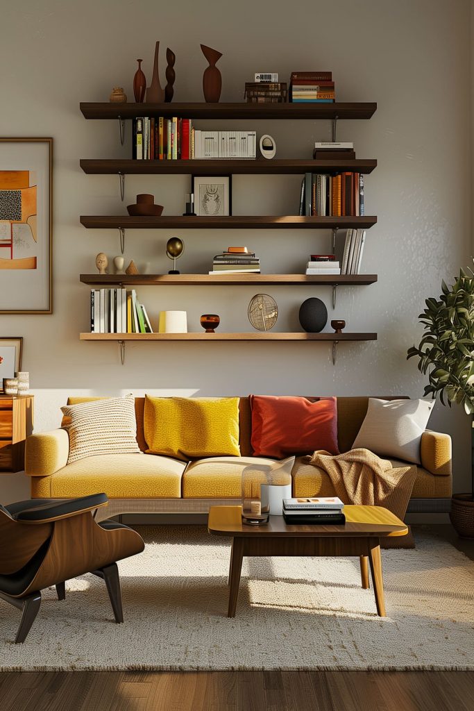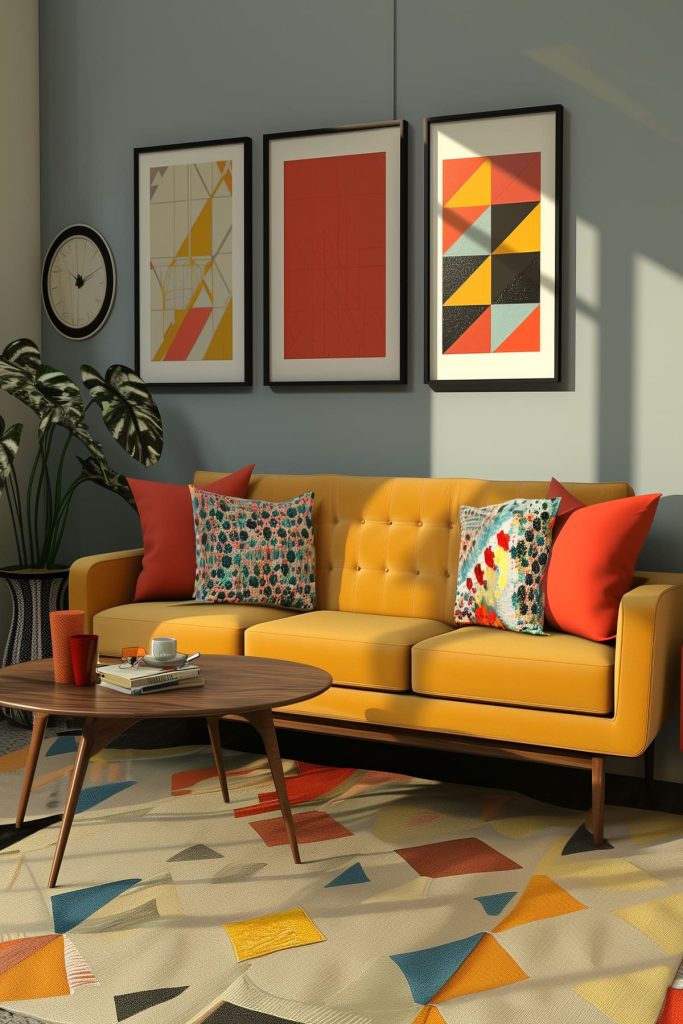 Infuse your midcentury modern living room with vibrant energy using bold color accents that pop against neutral backgrounds.