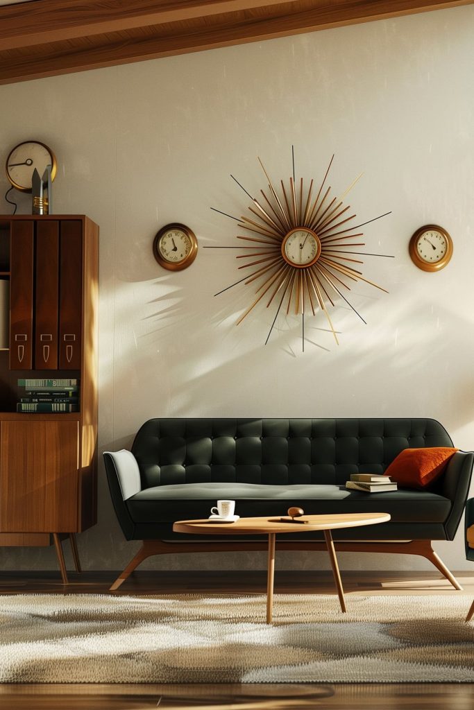 Embrace the Atomic Age aesthetic with retro-inspired accents like starburst clocks, atomic wall art, or futuristic-inspired furniture for a playful and nostalgic touch.
