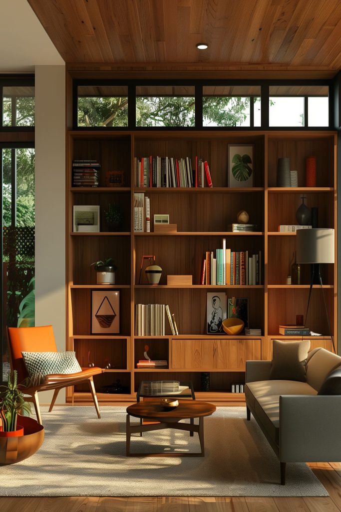 Install sleek built-in shelving or cabinetry to maximize storage space while maintaining a clean and minimalist look in your midcentury modern living room.