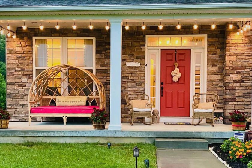 Blending the refreshing open air with comfortable seating, vibrant plants, and inviting lighting creates a cozy ambiance on your front porch.