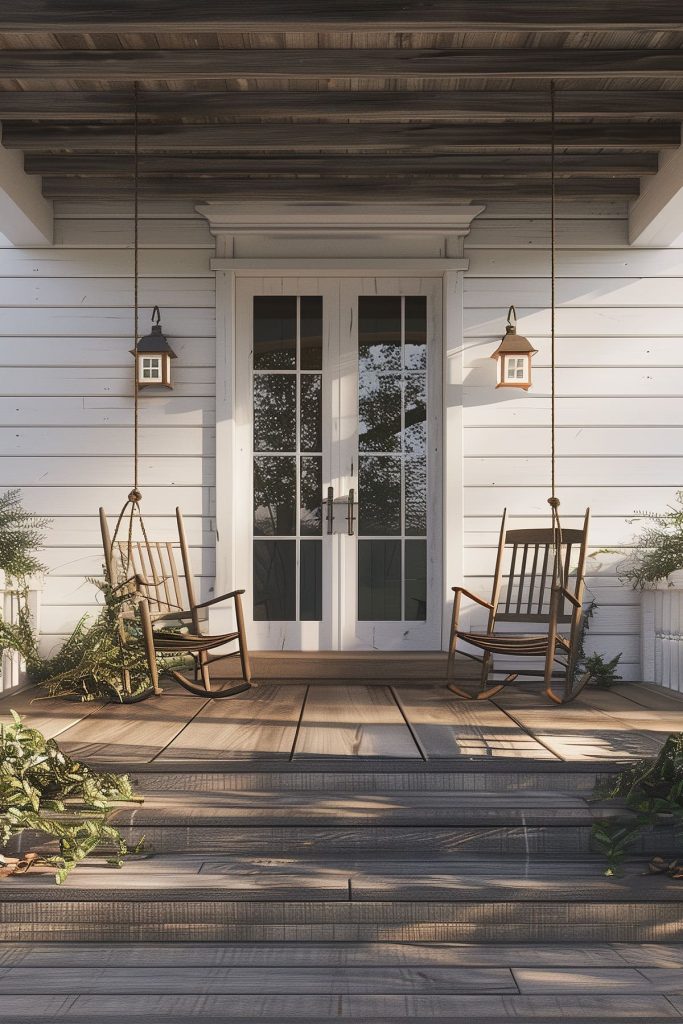 Hang a porch swing to add a touch of comfort and nostalgia, inviting guests to linger and enjoy the serene ambiance of your home’s entrance.