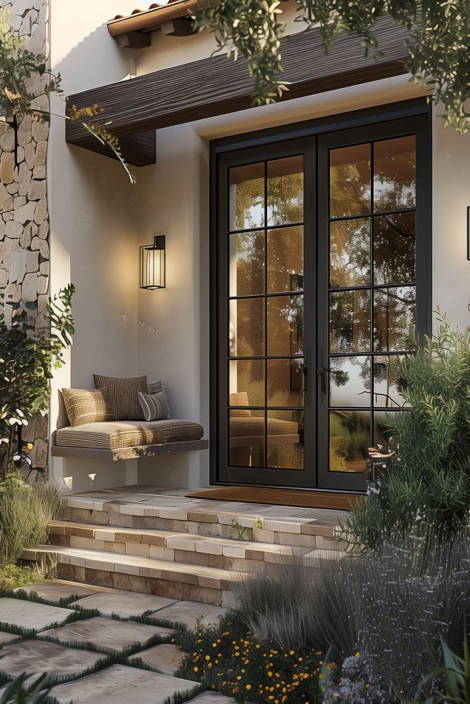 Transform your outdoor entryway into a cozy seating nook, offering a tranquil retreat for relaxation and contemplation. Nestle a bench or built-in seating amidst lush landscaping, providing a serene spot to enjoy the beauty of nature.
