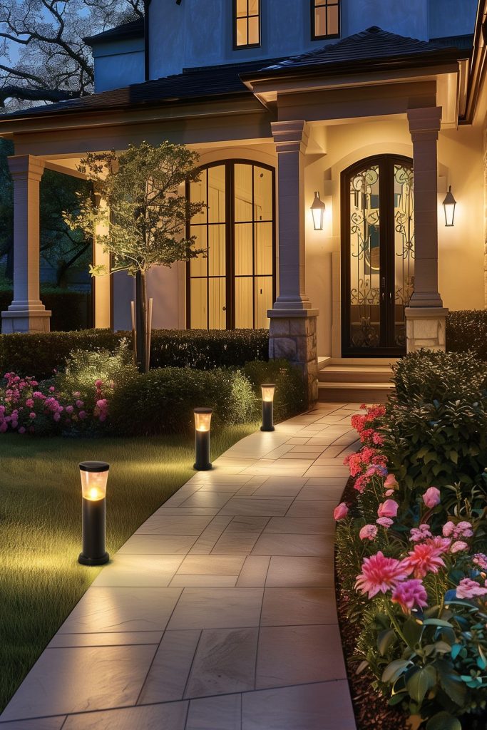 Illuminate your outdoor entryway with pathway lighting, guiding guests to your door with safety and style. Install solar-powered or low-voltage lights along the pathway, creating a welcoming ambiance while enhancing visibility at night.