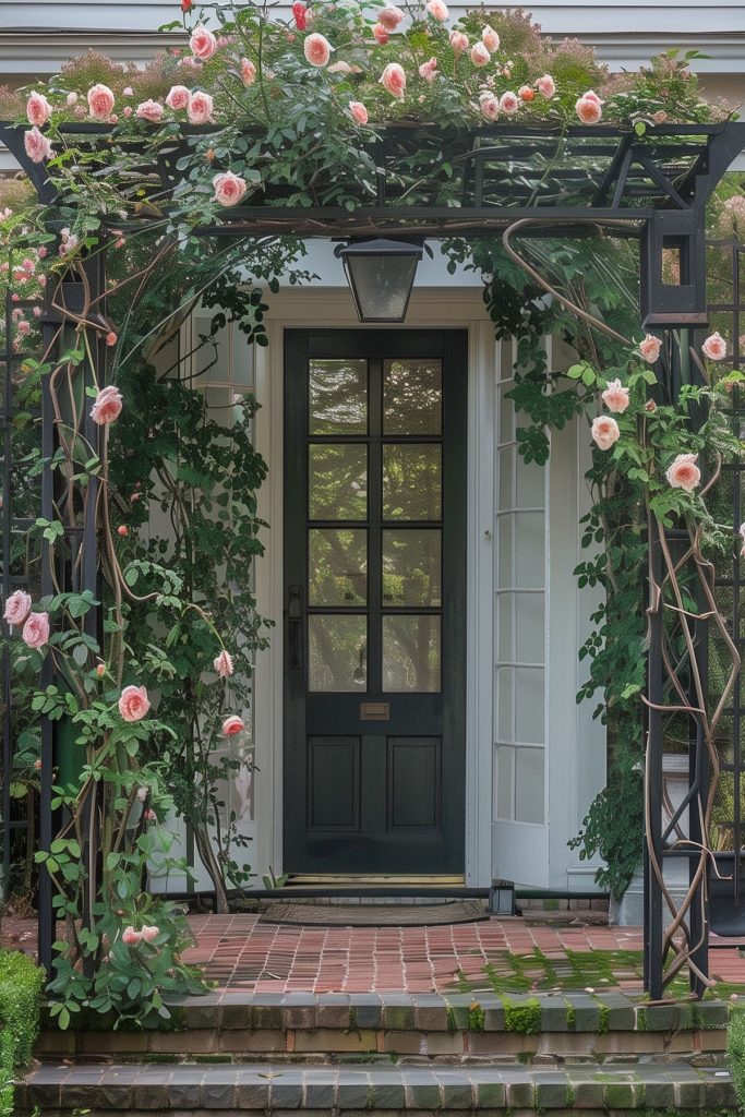 Frame your front door with an arbor or trellis adorned with climbing plants like roses or jasmine for a romantic touch.