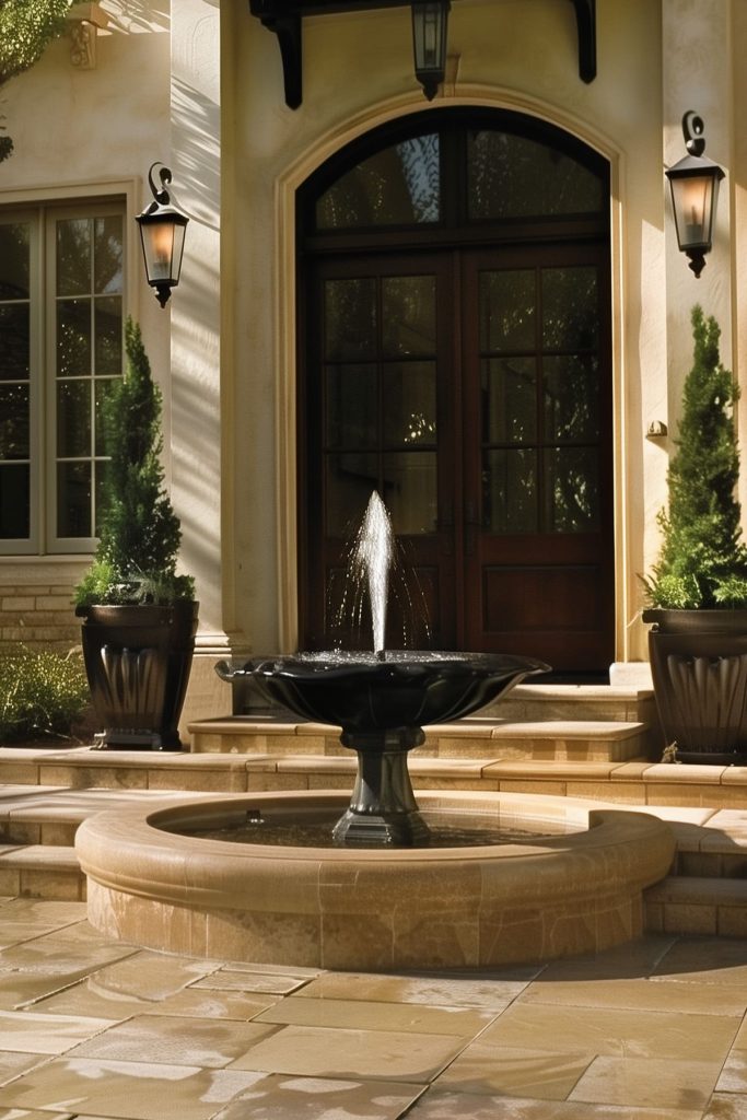 Elevate your outdoor entryway with a captivating fountain or water feature, adding a touch of tranquility and elegance to your space. The gentle sound of flowing water creates a serene ambiance, welcoming guests with a sense of calm and relaxation.