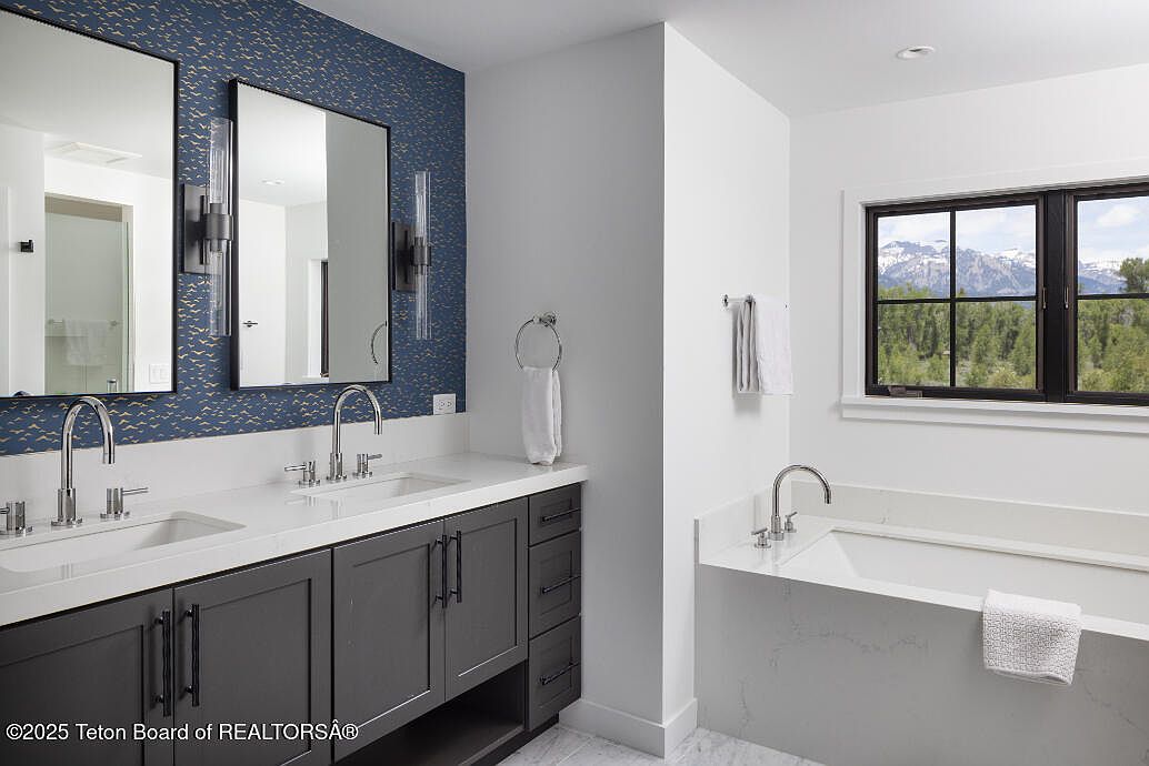 The master bathroom radiates modern elegance with a dual vanity in gray cabinetry topped by white surfaces. Contemporary wall sconces and expansive mirrors brighten the space, while navy wallpaper adds a refined touch. A large window frames mountain views, and a luxurious soaking tub promises relaxation. Minimalist fixtures maintain a clutter-free vibe, with ample storage and family-friendly features making this retreat both stylish and practical.
