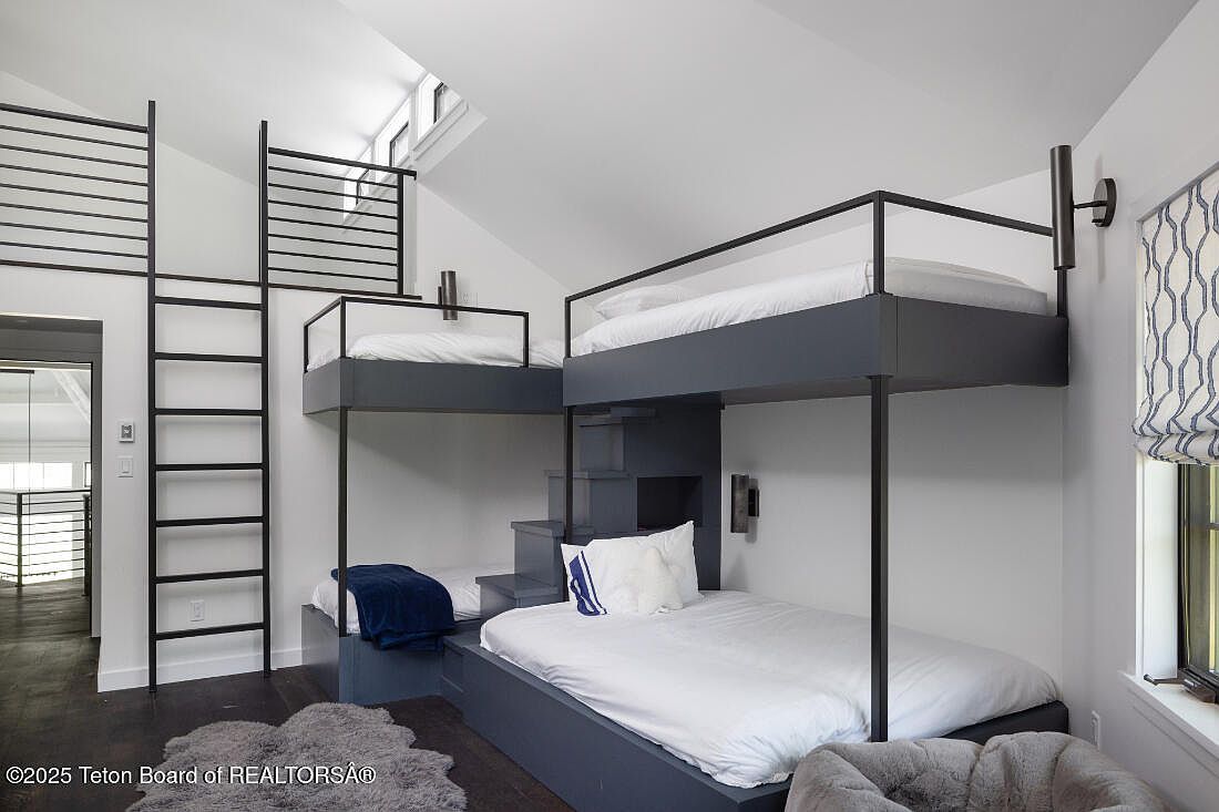 This contemporary kid’s room blends chic design with functional layout, suitable for siblings or friends. A bunk bed arrangement maximizes vertical space while keeping the room feeling open. Light walls pair with dark wood flooring for a warm, welcoming atmosphere. Crisp white and navy bedding maintain a restful vibe. A cozy reading nook with a plush rug and a modern chair completes the space, and plentiful natural light from multiple windows keeps the room bright for play and relaxation.