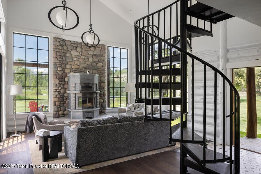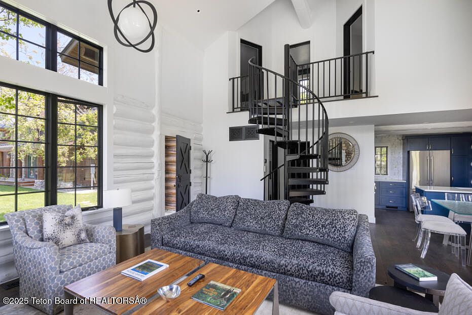 This living area fuses contemporary design with rustic charm, highlighted by a stone feature wall housing a sleek fireplace. Large windows bathe the space in natural light, creating a warm ambience and offering views of the surrounding landscape. The palette leans toward cool grays and soft whites, complemented by a plush sectional and decorative cushions. A unique spiral staircase leads to a loft, while a touch of bright blue cabinetry peeks in, tying the space together for gatherings and everyday living.