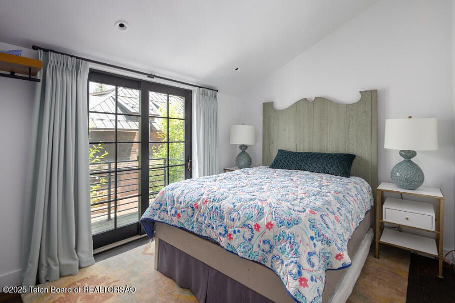 This snug bedroom combines contemporary and rustic elements, featuring a vaulted ceiling and French doors that invite daylight and outdoor views. A muted green headboard anchors a well-made bed, accented by a vibrant quilt. Nightstands with distinctive lamps flank the bed, and floor-to-ceiling drapes soften the windows. Warm wood floors contrast with light walls for a comforting, family-friendly atmosphere.