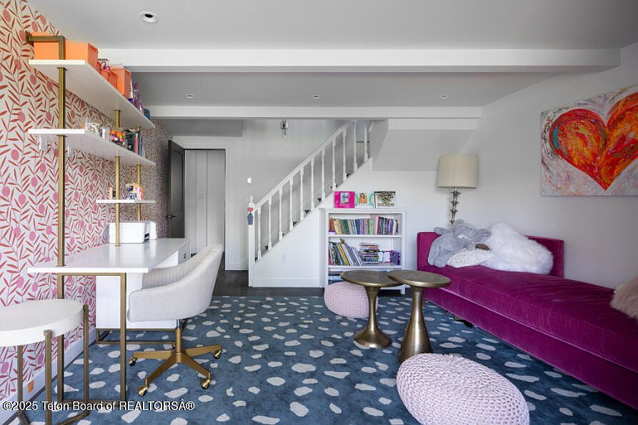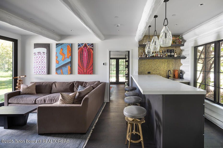 The living area pairs modern elegance with cozy charm. A plush sectional with textured cushions invites relaxation, complemented by vibrant artwork that adds a playful touch. The open layout benefits from abundant natural light, while a kitchen bar with sleek seating features a striking gold and black backsplash as a focal point. The rustic wood beams and contemporary lighting create a balanced, inviting atmosphere suited for family time or entertaining guests.