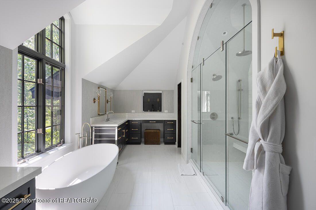The primary bathroom presents a vaulted, spa-like ambiance with a freestanding tub bathed in natural light along with views of the outdoors. Dark cabinetry contrasts with light marble countertops, delivering a modern yet timeless feel. A glass-enclosed shower with sleek fixtures, complemented by warm gold hardware, and ample storage contribute to a stylish, family-friendly retreat.