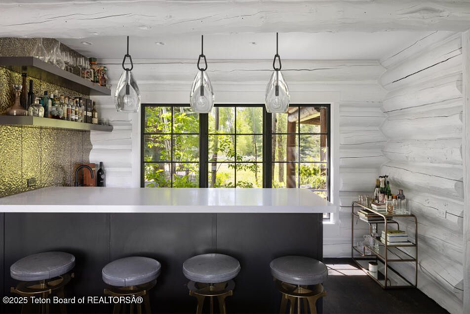 This stylish home bar combines sleek, contemporary design with rustic charm. White log walls contrast with dark cabinetry, producing a welcoming atmosphere. A pristine white bar counter offers ample entertaining space, complemented by three stylish circular stools. Glass pendant lights provide soft illumination, while a textured metallic backsplash adds a distinctive touch. Open shelving showcases a curated collection of spirits, and large black-framed windows flood the room with daylight, connecting it to the outdoors.