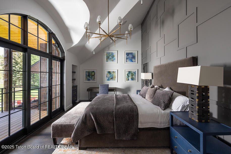 The master suite blends sophistication with comfort, featuring vaulted ceilings and oversized windows that flood the room with daylight. A gray accent wall with geometric paneling adds texture, while a plush king bed is layered with soft bedding and decorative pillows. Nightstands with distinctive lamps flank the bed, and a stylish bench at the foot provides extra seating. Artwork in soothing blues complements the color palette. A desk and seating area offer a quiet corner for work, making it a welcoming family retreat.