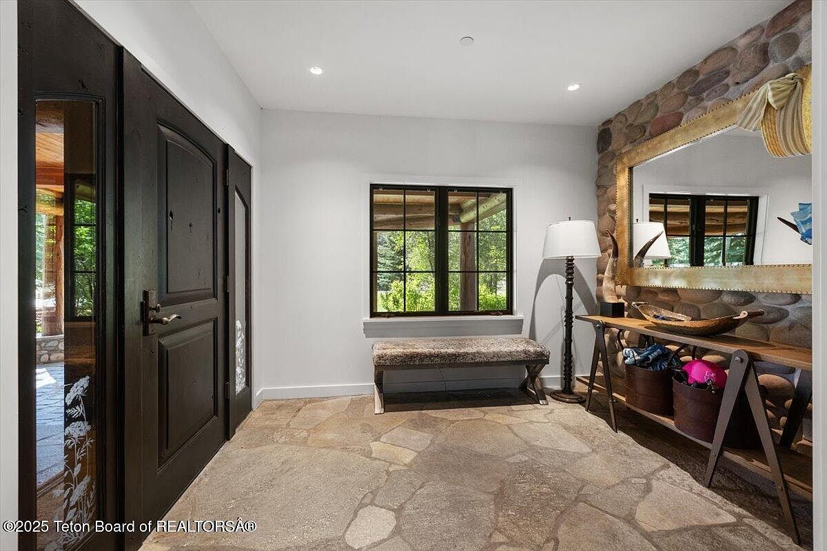 The entry blends rustic charm with contemporary elegance, featuring dark wood accents and natural stone flooring. A substantial black front door with glass panels opens into a bright foyer, where a cozy bench invites visitors to pause. A tall lamp casts a warm glow, while a large mirror reflects light, expanding the sense of space. The combination of stone texture and smooth furnishings creates a harmonious welcome perfect for gatherings.