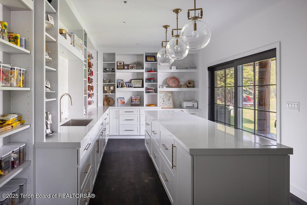 This contemporary kitchen showcases crisp white cabinetry accented with subtle gold details that add a touch of refinement. The generous island, topped with pristine white quartz, provides a functional workspace and gathering spot with ample storage. Open shelving displays a curated mix of decorative pieces and kitchenware. Natural light pours in through large windows, merging the indoors with the outdoors. Polished hardware and modern pendant lighting contribute to a welcoming ambiance, ideal for family meals and culinary creativity.