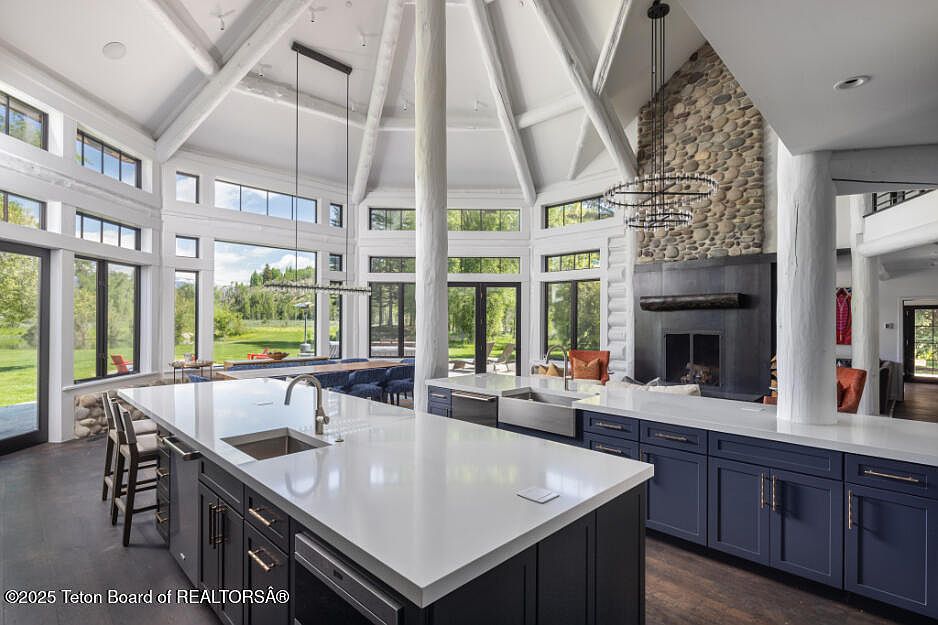 This expansive kitchen merges contemporary elegance with rustic charm. A wide island with a sleek white countertop serves as a central hub for family interaction. Rich navy cabinetry contrasts beautifully with bright finishes, enhancing the welcoming atmosphere. The tall, vaulted ceiling, along with exposed wooden beams and a statement chandelier, creates an airy, open feel. Large windows frame lush outdoor views, filling the space with natural light. Practical features include ample seating and easy access to the adjoining living area, making this kitchen ideal for entertaining and daily living.