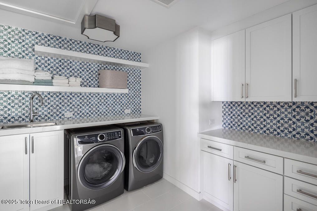 The laundry room blends practicality with style, featuring navy and white patterned tiles as a bold backdrop. Front-loading appliances sit beneath a long countertop, with white cabinetry and open shelving providing ample storage for towels and essentials. A polished metal sink completes the look, and soft lighting enhances the workspace, making laundry tasks more enjoyable. The layout emphasizes organization and ease of use for a busy family.