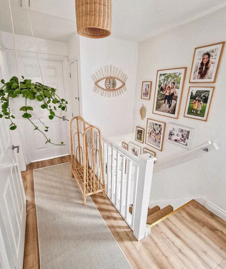 Add a touch of bohemian flair to your landing with a rattan shelf that enhances both style and functionality. This piece not only fits seamlessly with other boho decor but also provides extra storage. Complement the shelf with coordinating frames or materials nearby to maintain a harmonious, cohesive aesthetic. The balance of practicality and charm makes it an ideal way to organize and elevate your space.