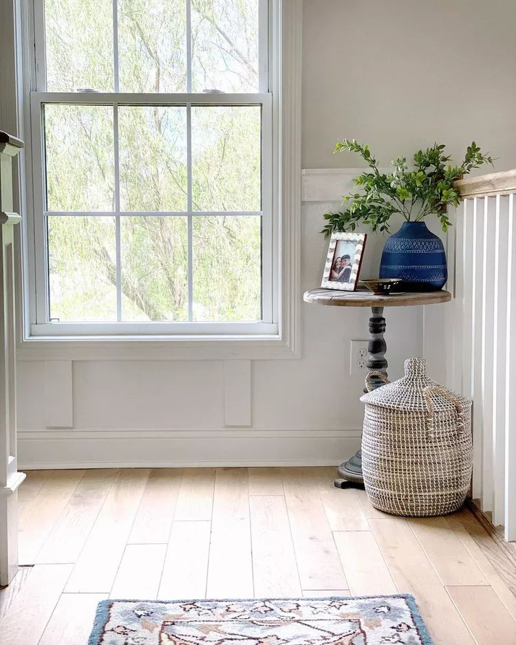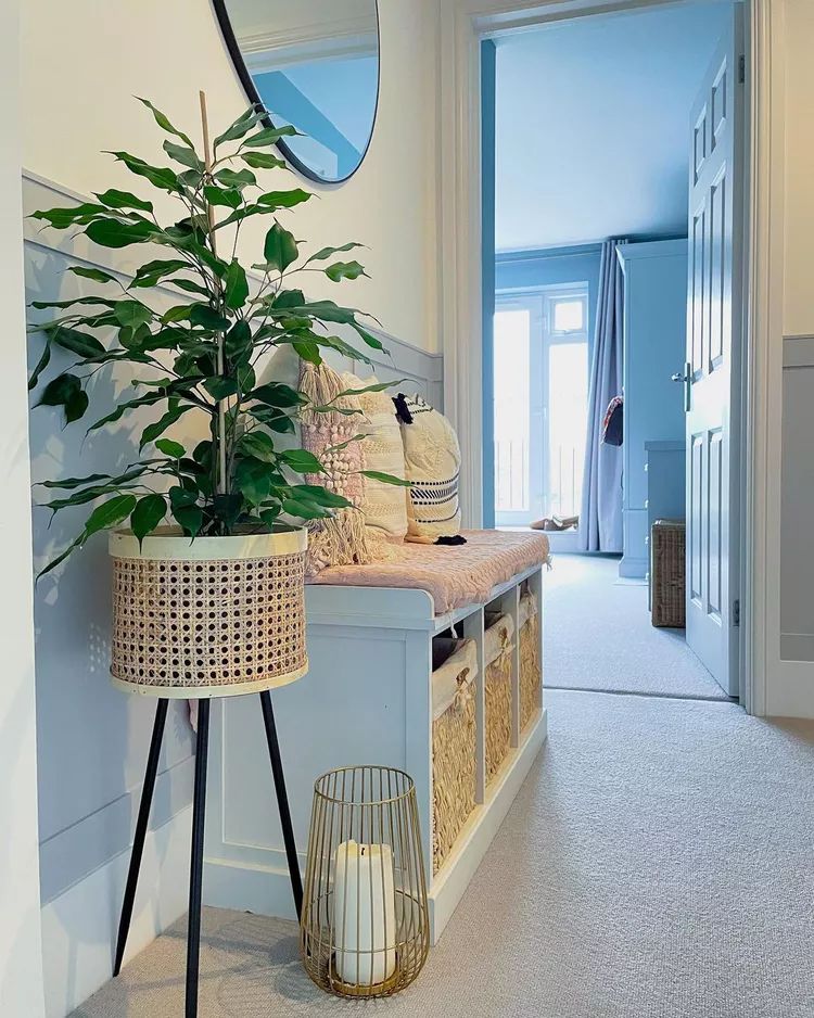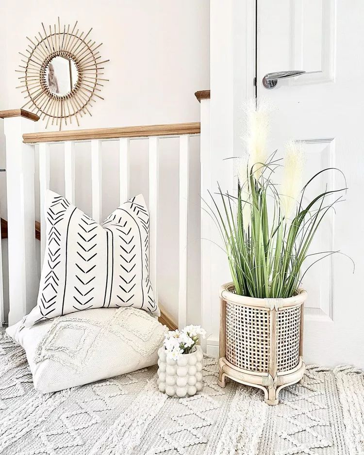 Add a touch of charm to your faux tree by placing it in a stylish planter, like a woven basket. This simple yet effective idea enhances the landing area with a natural, farmhouse-inspired look. It’s a great way to incorporate greenery while keeping the aesthetic cozy and welcoming.