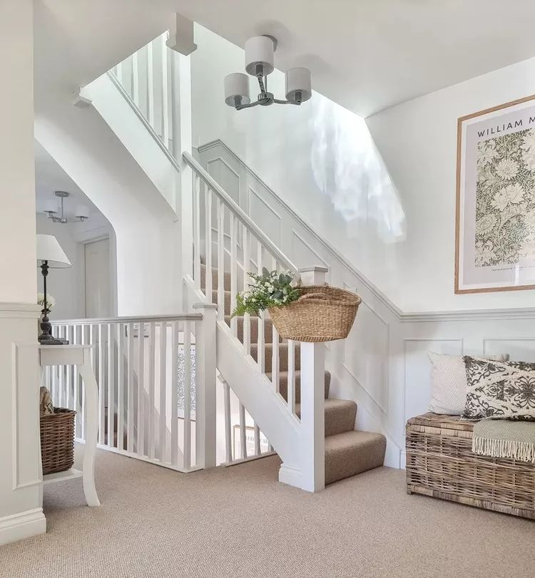 Choose a chic storage basket to keep odds and ends concealed in the landing area. Look for designs that complement the decor, like woven or textured options that align with a cozy or cottage-core aesthetic. Avoid transparent bins, as they can create visual clutter, and instead opt for a basket that blends seamlessly with your space while maintaining a tidy, organized look.