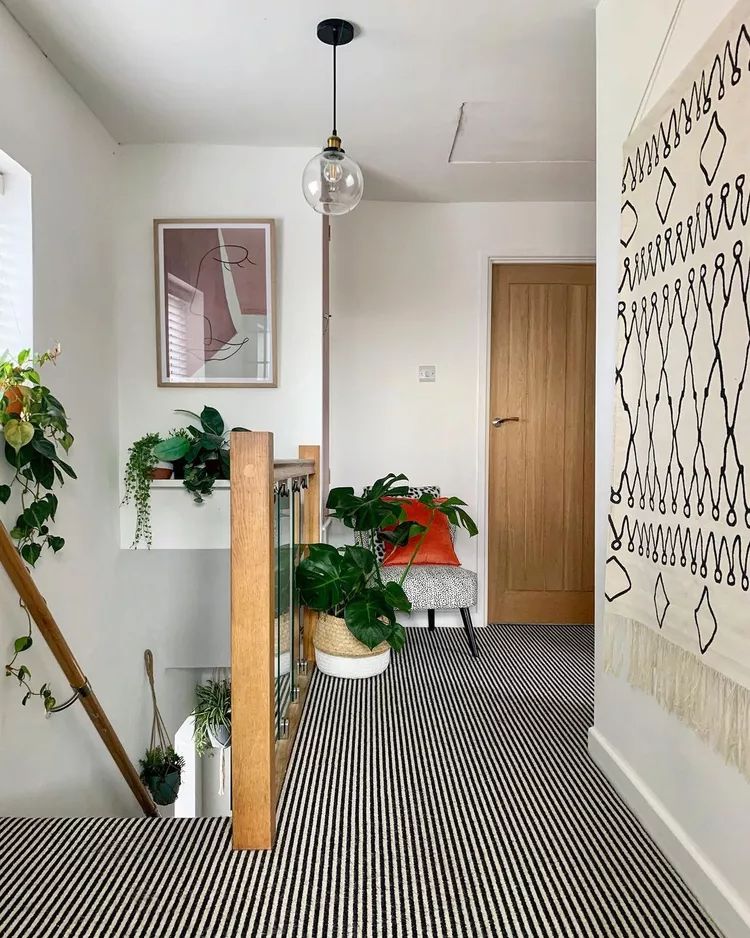 For those who prefer a minimalist landing with fewer furniture pieces, rugs are a fantastic way to introduce both style and texture. A woven, circular rug, for instance, can infuse a soft, tactile element into your hallway, adding visual interest without overwhelming the space. It’s a simple yet effective way to elevate your landing, giving it a cozy, welcoming vibe while maintaining an open feel.