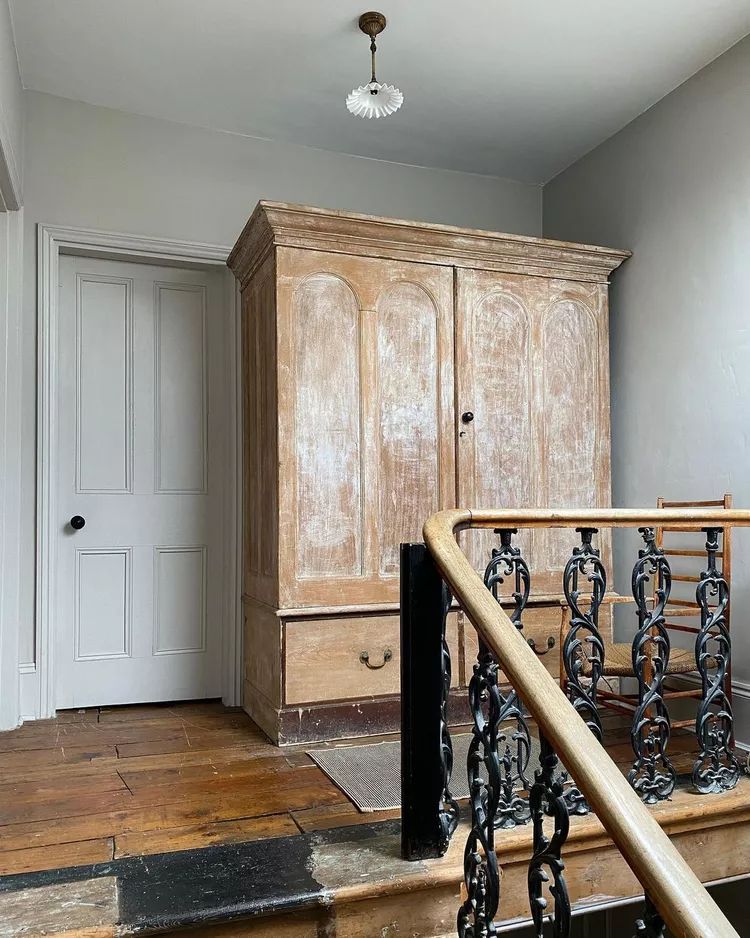 A large armoire on the landing offers substantial storage space for larger items like linens, seasonal clothes, and sweaters. This practical addition can help free up other areas in your home by providing an organized solution for bulky belongings, creating a more functional and tidier upstairs. Consider a similar storage piece to maximize your landing’s utility while keeping things neat and easily accessible.