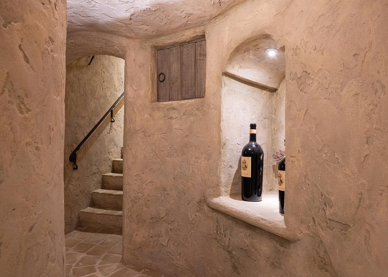 This cozy wine cellar features rustic design elements with textured plaster walls that create a warm, inviting atmosphere. The layout includes a narrow passage leading to a staircase, enhancing the sense of intimacy. Recessed alcoves hold elegant bottles of wine, subtly illuminated for a sophisticated look. The earthy color scheme of soft tan and warm beige complements the natural stone flooring, offering a family-friendly space ideal for gatherings. A wrought-iron railing adds character while ensuring safety. This cellar is perfect for cultivating family memories and enjoying evenings filled with laughter and conversation.