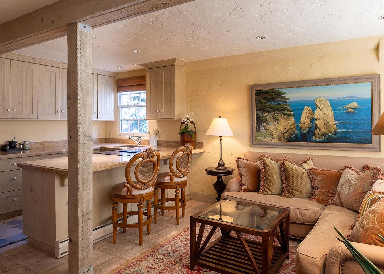 This open concept kitchen and lounge area features a welcoming and family-friendly design. The light wood cabinetry, paired with warm beige walls, creates an inviting atmosphere. A granite countertop serves as a functional workspace, complemented by stylish wooden bar stools with caned backs for casual dining. The cozy seating area showcases a plush sectional sofa adorned with patterned pillows, enhancing comfort. A rich area rug adds texture beneath a sleek coffee table. Natural light floods in from the window above the sink, highlighting a serene painting of coastal rocks, contributing to a harmonious and relaxed setting perfect for family gatherings.