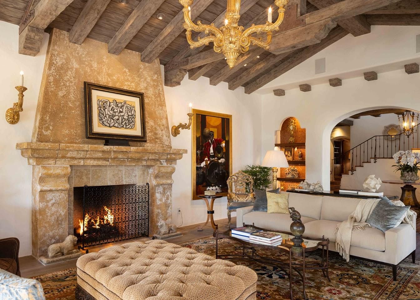 This inviting living room features a stunning stone fireplace as the focal point, richly adorned with elegant wall sconces that frame an intricately designed piece of art above. Exposed wooden beams stretch across the ceiling, adding warmth to the space. A plush, tufted ottoman sits on a vibrant area rug, surrounded by a contemporary sofa and ornate seating, promoting family interaction. Decorative shelves with charming accents and an eye-catching staircase lead to other areas of the home. Soft neutral tones are complemented by splashes of color, ensuring a cozy, welcoming ambiance perfect for family gatherings.
