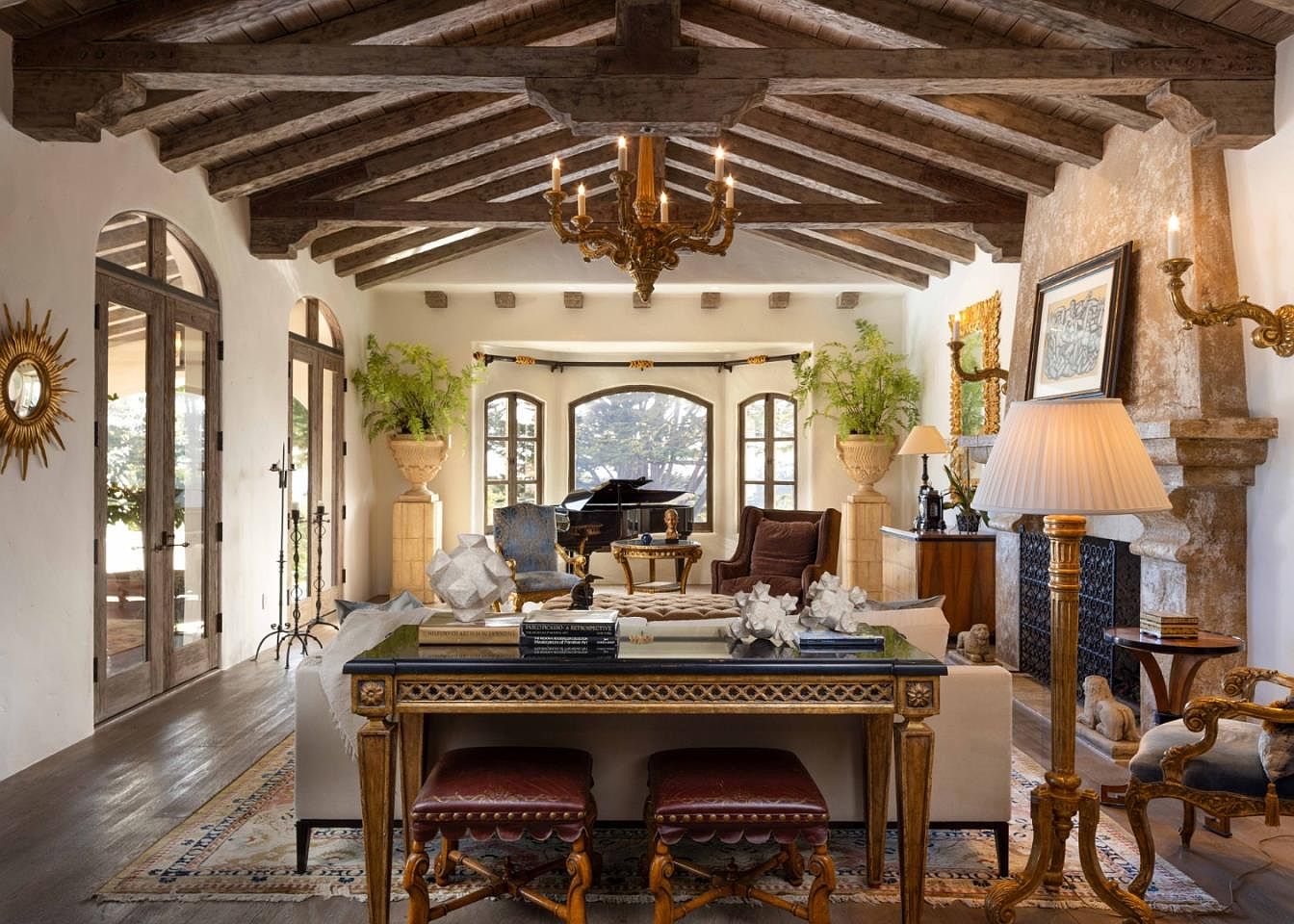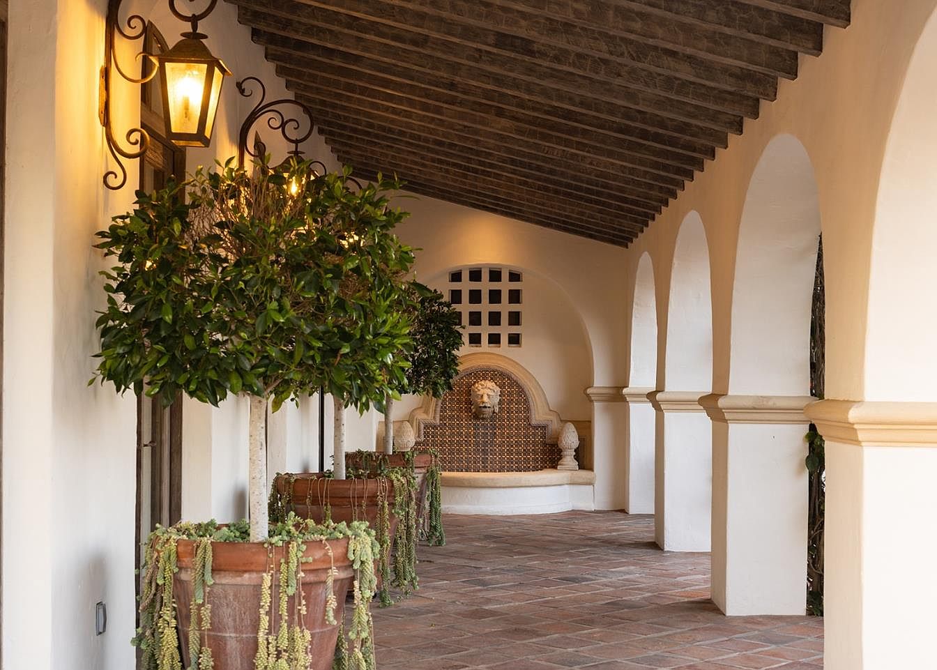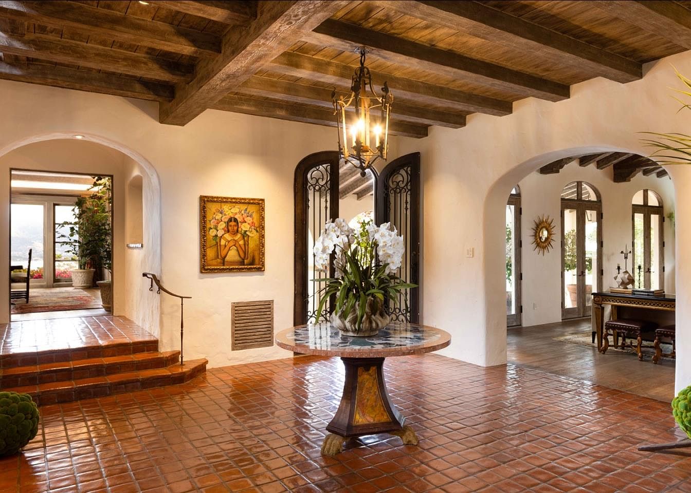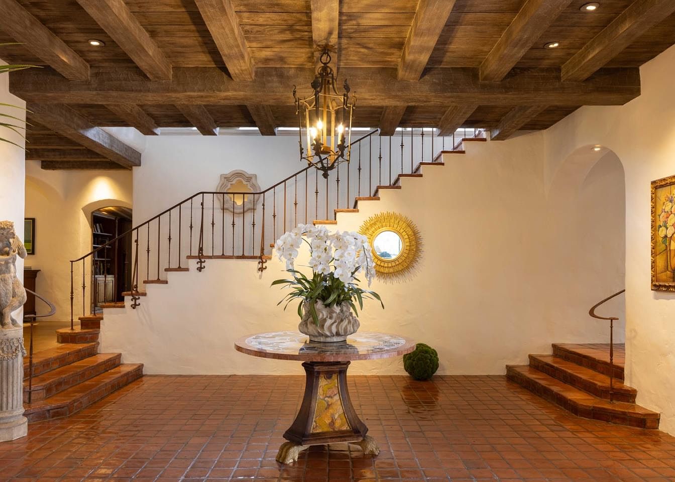 The entryway exhibits a warm, inviting atmosphere with terracotta tiled floors that enhance the rustic Spanish aesthetic. Vaulted beams in rich wood add architectural interest, paired with a stylish lantern chandelier that illuminates the space. A round table at the center showcases a large arrangement of vibrant white orchids, creating a focal point. The soft, earth-tone wall colors complement the natural elements, while arched doorways lead to the adjacent living areas and outdoor views. Decorative artwork adds personality, making this area perfect for welcoming family and guests, promoting a cozy, family-friendly environment.