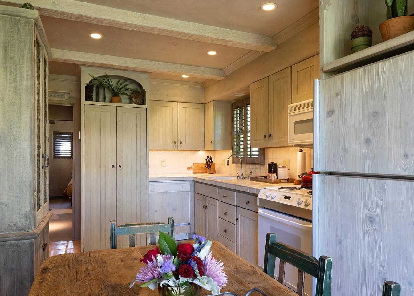 The kitchen features a warm, inviting layout with rustic charm, highlighted by natural wood accents and neutral colored cabinetry. The countertops are elegantly finished with clean, white tiles, providing a practical cooking space. A large farmhouse table occupies the center, adorned with a vibrant floral centerpiece, perfect for family gatherings. Above, exposed wooden beams add character, while strategically placed recessed lighting enhances the cozy ambiance. Open shelving showcases potted plants, promoting a fresh, lively atmosphere. Ample cabinetry offers plenty of storage, making it an ideal family-friendly environment for culinary adventures and shared meals.