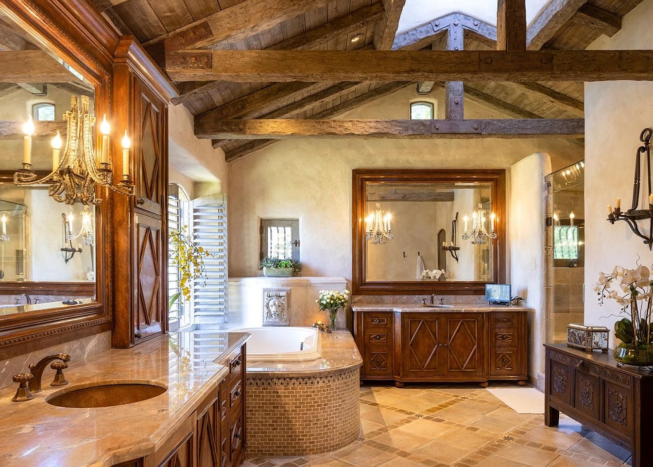 This master bathroom features a luxurious design with high, wooden beam ceilings contributing to a spacious feel. The elegant vanity is crafted from rich wood, showcasing intricate detailing, complemented by a polished marble countertop. A large, ornate mirror reflects the natural light from windows adorned with wooden shutters. A cozy soaking tub curves gracefully into the corner, surrounded by tiled accents, creating a serene retreat. Two stylish chandeliers and wall sconces enhance the soft ambiance. Tasteful decor including potted plants and fresh flowers adds warmth, making this a perfect family-friendly sanctuary for relaxation and self-care.