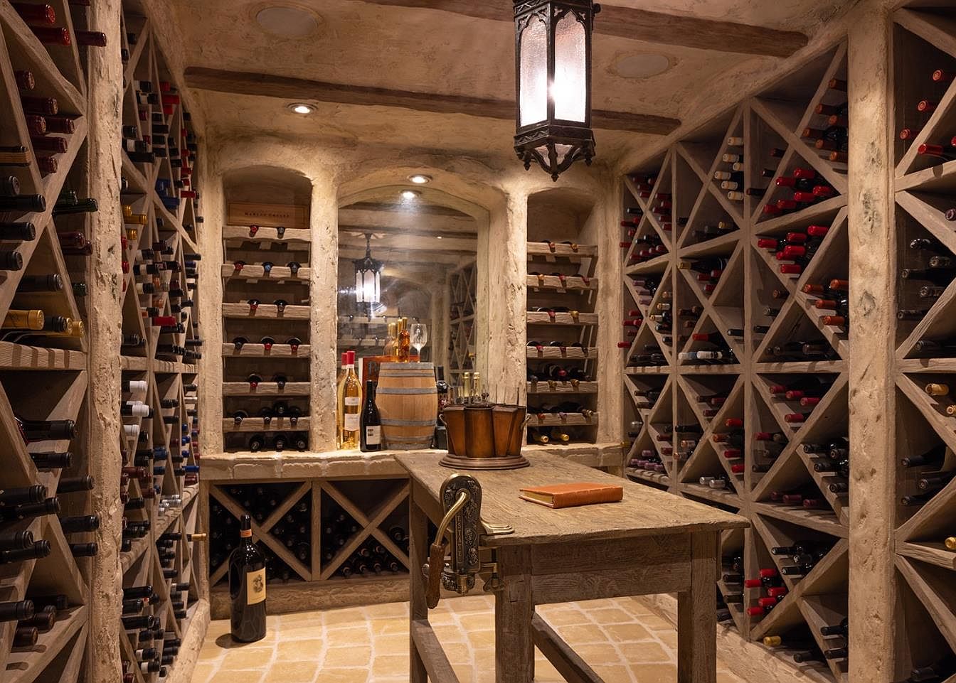 This charming wine cellar features an inviting layout with rustic wooden shelves arranged in an intricate diamond pattern for optimal wine storage. Earthy tones dominate the space, with stone walls and warm wood beams contributing to the cozy atmosphere. A central wooden table provides a spot for tasting or serving, accented by a decorative barrel. Ambient lighting from a vintage-style lantern enhances the intimate feel, while an elegant mirror reflects the bottles, adding depth. The room is designed for family gatherings, promoting a sense of luxury and comfort, making it a perfect escape for wine enthusiasts.