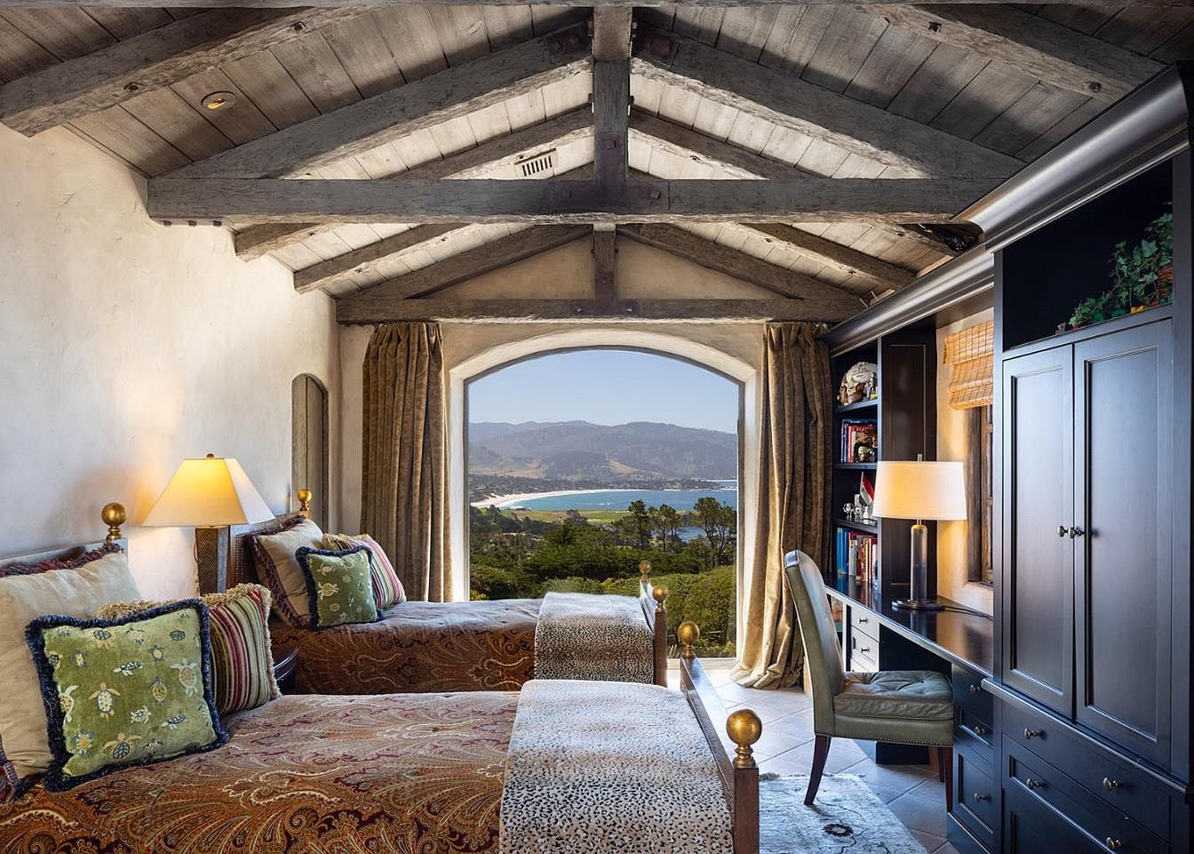 This charming bedroom features two twin beds adorned with richly patterned bedding, complemented by decorative pillows in vibrant colors. The inviting space boasts exposed wooden beams and a high vaulted ceiling, enhancing its cozy yet spacious feel. A large, arched window offers breathtaking views of rolling hills and blue waters, flooding the room with natural light. Luxurious gold accents on the bed posts and stylish drapery create a warm atmosphere, while a built-in desk with a comfortable chair inspires creativity or study. The tasteful decor and serene ambience make it perfect for family gatherings or restful nights.