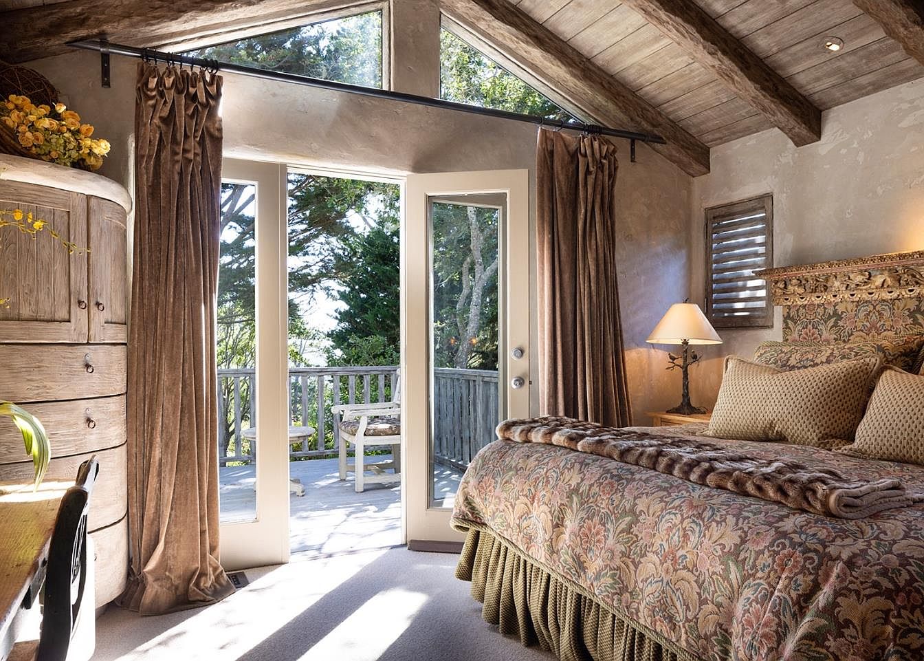 A cozy bedroom featuring a beautifully detailed queen-sized bed adorned with luxurious floral-patterned bedding. The room boasts a high vaulted ceiling with exposed wooden beams, enhancing its spacious feel. Large double doors lead to a private balcony, inviting natural light and offering serene views of the surrounding trees. Soft beige curtains frame the windows, complementing the warm color palette of the room. A rustic wooden dresser adds character, while a bedside lamp provides warmth for evening reading. The plush carpet underfoot enhances comfort, making this space perfect for family relaxation and peaceful nights.