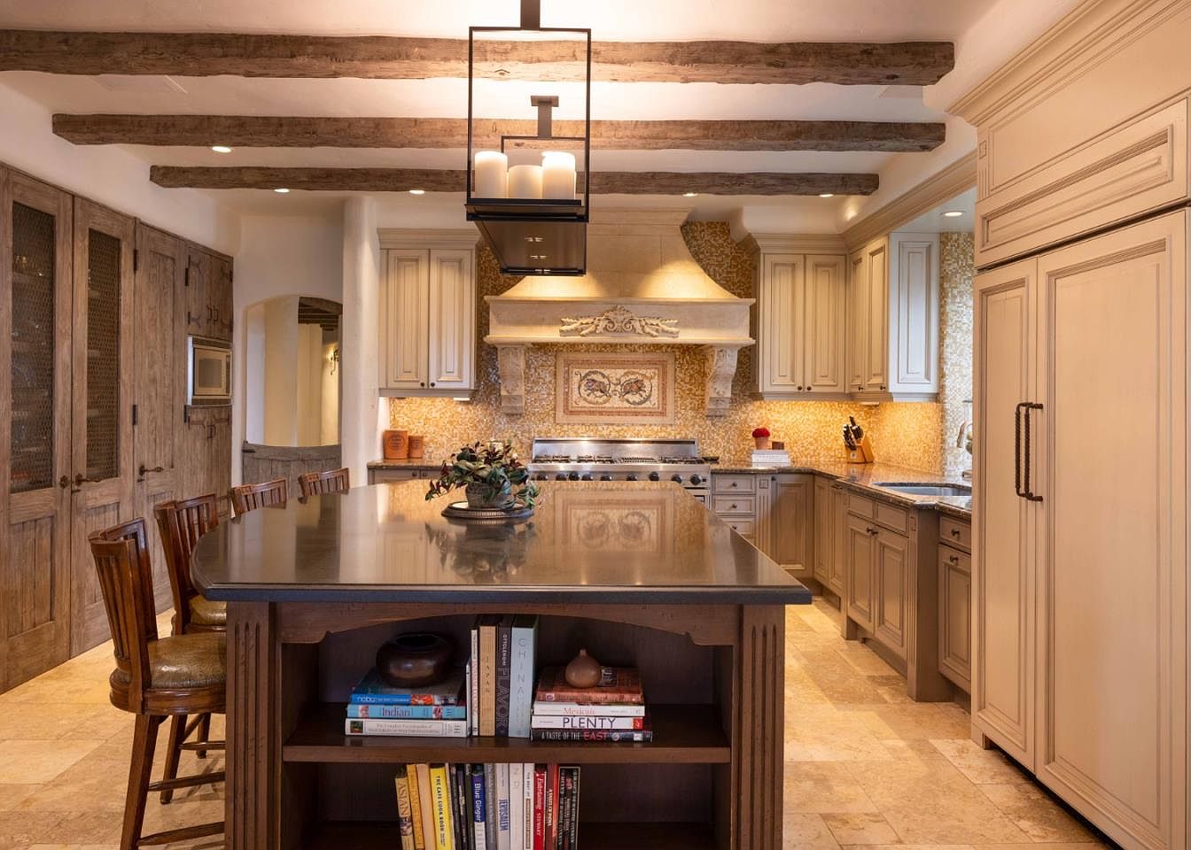 This inviting kitchen features a spacious island with a dark countertop, perfect for family gatherings and meal prep. Elegant wooden bar stools provide casual seating, while rich, warm tones dominate the cabinetry and flooring. Exposed wooden beams cross the ceiling, enhancing the rustic charm. The beautifully crafted range hood is complemented by an intricate mosaic backsplash, adding a touch of artistry. Light streams in through the windows, illuminating the soft beige and cream color palette. Practicality meets style with ample storage solutions, and a cozy nook for cookbooks, making this kitchen a functional heart of the home.