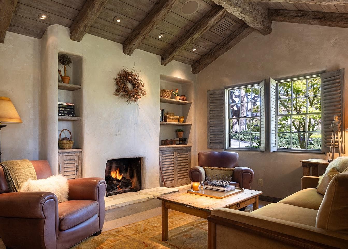 This inviting living room features a warm, rustic design with a focus on comfort. Exposed wooden beams create a charming ceiling, while the soft, neutral wall tones enhance the cozy atmosphere. Two plush leather armchairs, paired with a soft throw, invite relaxation. A natural wood coffee table sits centrally, topped with books and a candle. The fireplace, framed in stone, adds a focal point that radiates warmth. Built-in shelves on either side, adorned with baskets and decorative items, provide storage and style. Large shutters invite natural light, making this space perfect for family gatherings or quiet evenings.