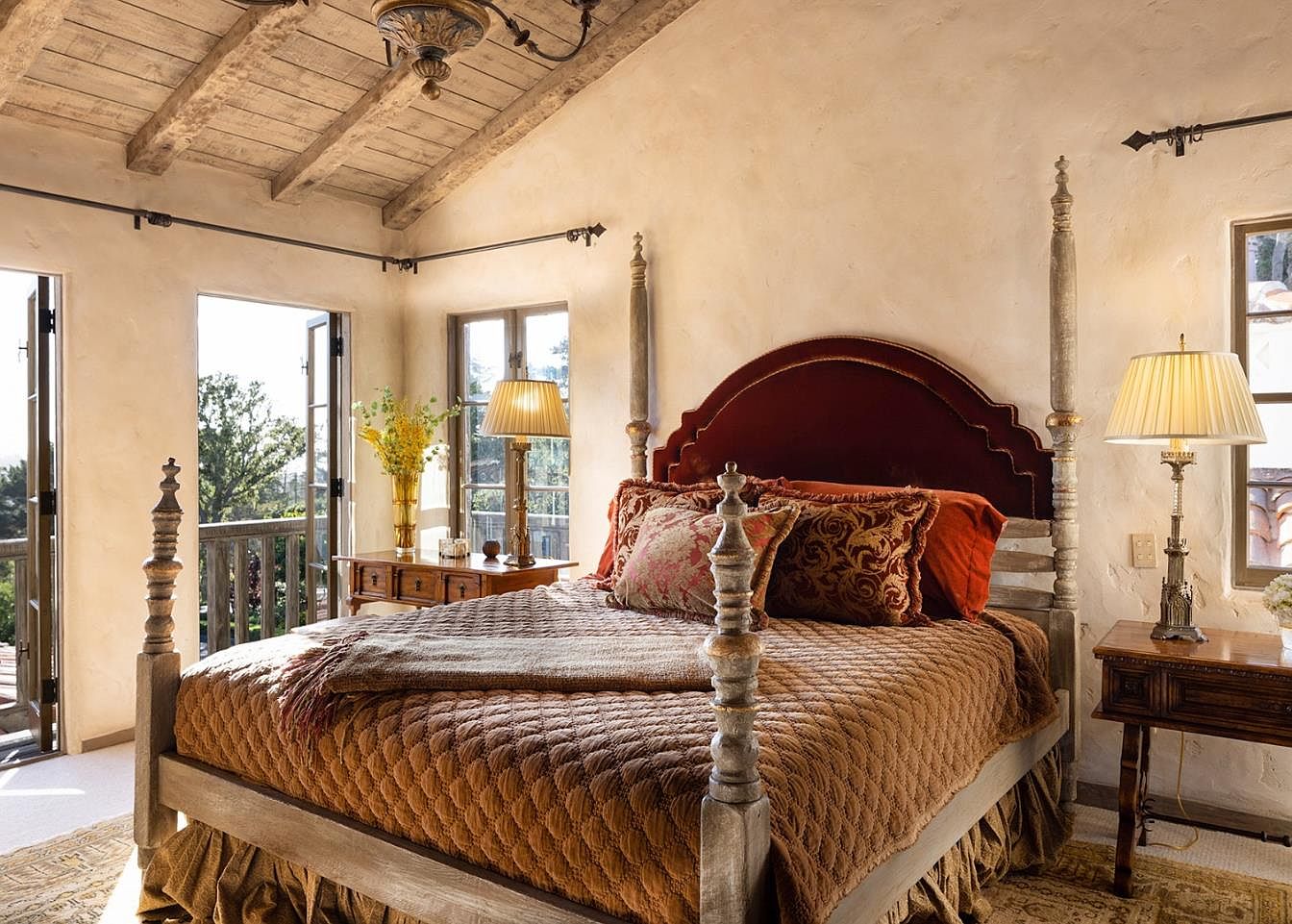 This spacious bedroom features a grand four-poster bed with intricate wooden details and a rich burgundy headboard, complemented by luxurious dark and light throw pillows. The walls are adorned with a warm beige plaster, creating an inviting atmosphere. Two large windows allow natural light to flood in, framed by charming wooden shutters, and offering a view of the lush outdoors. An elegant nightstand, topped with a tasteful lamp, provides both functionality and style. The earthy, warm color palette of browns and golds enhances the cozy, family-friendly vibe, making it a perfect sanctuary for relaxation.