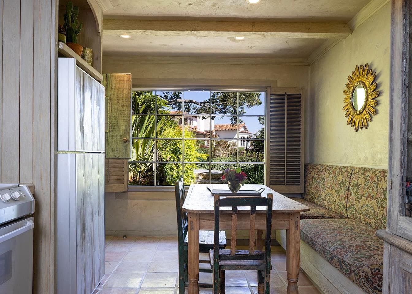 This charming kitchen nook features a rustic wooden dining table accompanied by mismatched chairs, inviting family gatherings. A cozy built-in bench, adorned with intricate floral upholstery, adds comfort while offering a lovely view through large windows that brighten the space. Natural light floods in, enhancing the warm earth tones of the walls and the subtle texture of the tiled floor. The minimalist cabinetry combines a soft color palette of greens and neutrals, harmonizing with the greenery visible outside. The round mirror on the wall adds a touch of elegance, reflecting light and creating a welcoming ambiance perfect for family meals.