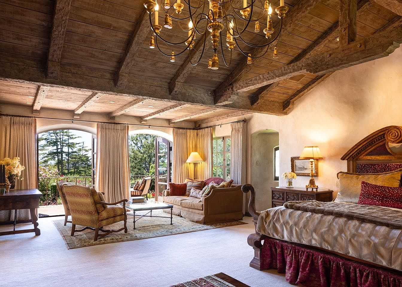 This spacious master bedroom boasts an inviting design, featuring a soaring beamed ceiling that enhances the open feel. The warm color palette blends soft creams and rich reds, accented by plush textiles and elegant furnishings. A luxurious king-sized bed is complemented by decorative pillows and a textured throw. The cozy seating area includes a comfortable sofa and a patterned armchair, perfect for relaxation. Large arched windows invite natural light and frame scenic views, while delicate sheer curtains add a touch of elegance. An ornate chandelier and tasteful decor details create a charming, family-friendly atmosphere.