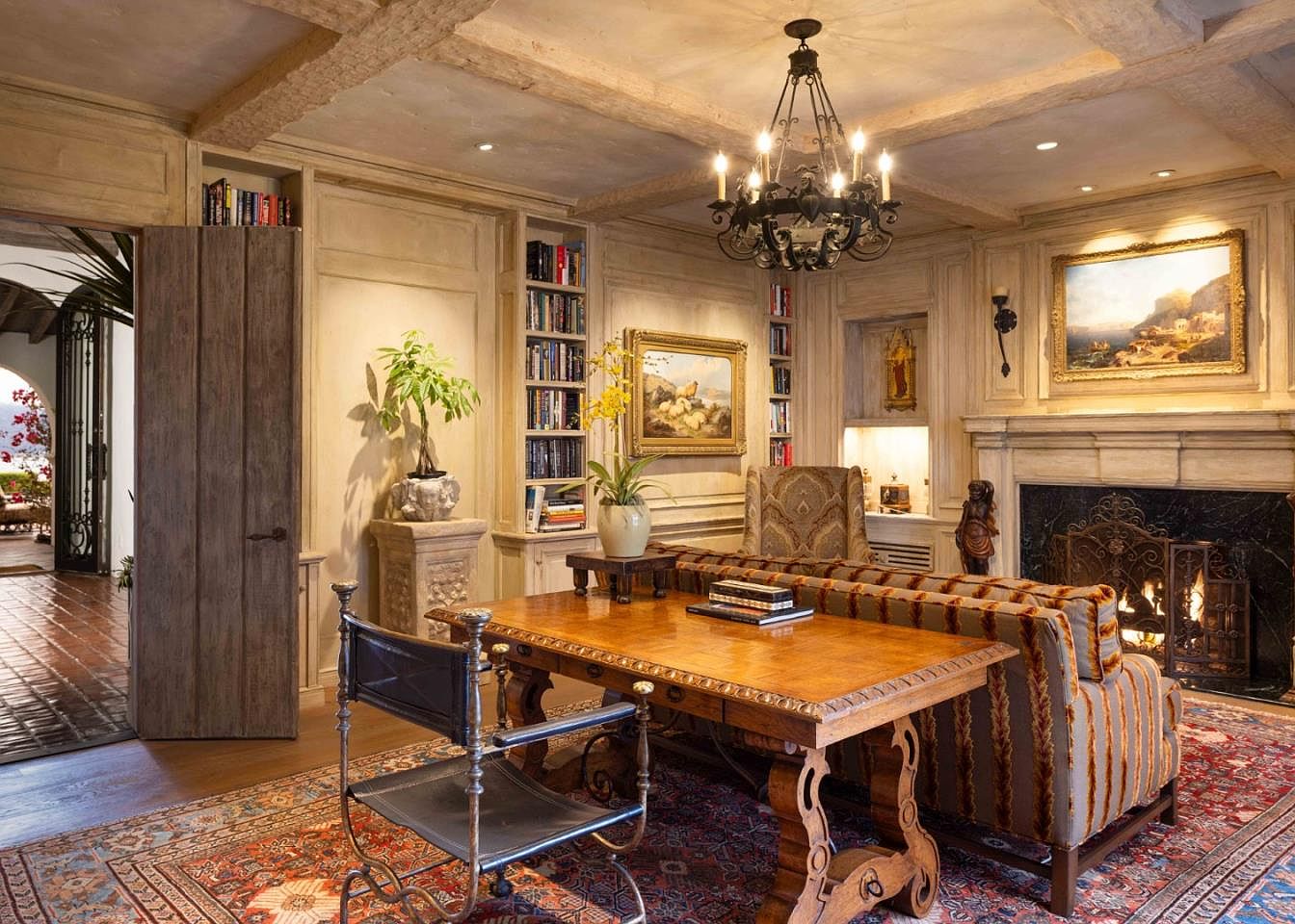 This inviting family room features an elegantly rustic design, showcasing warm beige walls and exposed wooden beams. A cozy sofa adorned with rich, striped upholstery faces a grand fireplace, creating a perfect gathering spot for family. A polished wooden table rests at the center, accompanied by an artistic metal chair—ideal for casual meals or game nights. To one side, built-in bookshelves lined with books provide a charming touch and easy access to family reads. Decorative elements include a vibrant area rug that adds warmth and texture, along with thoughtful plant displays enhancing the homey atmosphere.