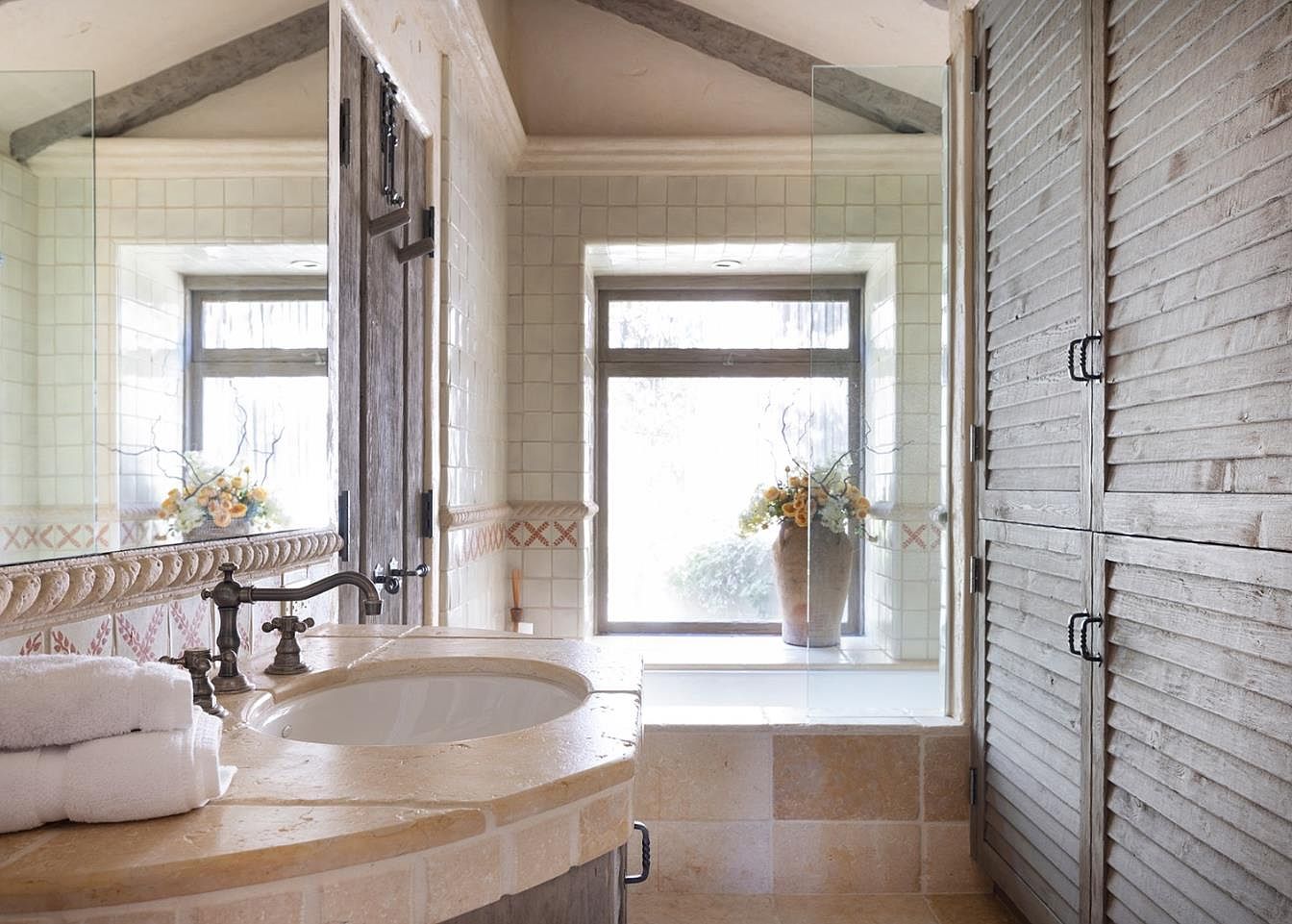This spacious bathroom features a serene, family-friendly layout, highlighted by natural light streaming through large windows. The elegant design includes a curved countertop with a double sink, surrounded by soft cream and beige tile accents. A glass shower provides a contemporary touch, while rustic wooden doors add warmth and character. Decorative elements, such as a vase of fresh flowers, enhance the inviting atmosphere. Exposed beams on the ceiling coupled with intricate moldings contribute to the room’s charm, making it a perfect blend of functionality and aesthetics, ideal for family relaxation after a long day.