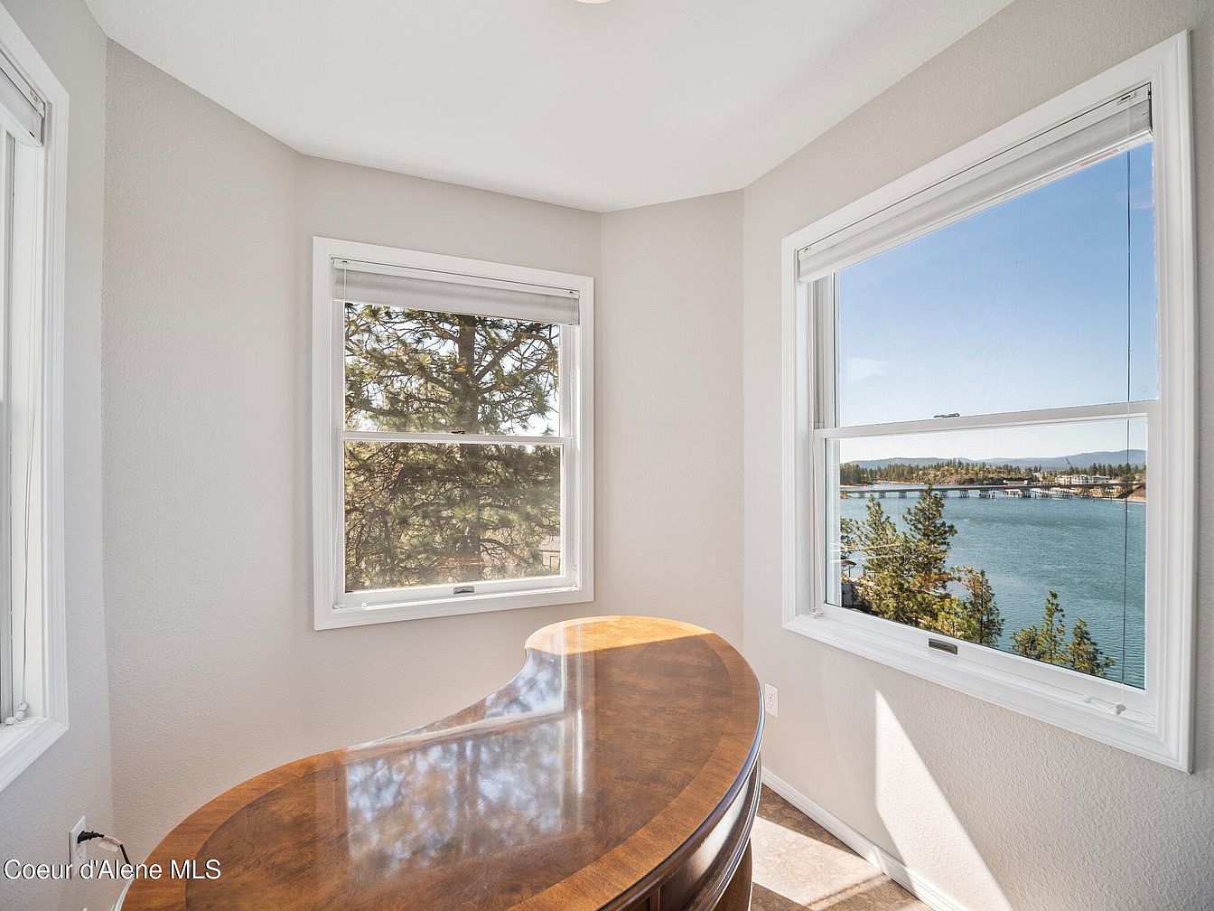 This cozy corner nook features a polished, curved wooden desk positioned perfectly between two large windows showcasing breathtaking views of a serene waterfront and surrounding trees. The walls are painted a soft, warm beige that complements the rich texture of the desk’s wood, enhancing the room’s inviting atmosphere. White trim around each window adds a clean, crisp contrast to the neutral walls. The natural light streaming through the windows illuminates the space, creating a bright and tranquil area ideal for focused work or quiet contemplation while enjoying the scenic outdoor landscape.
