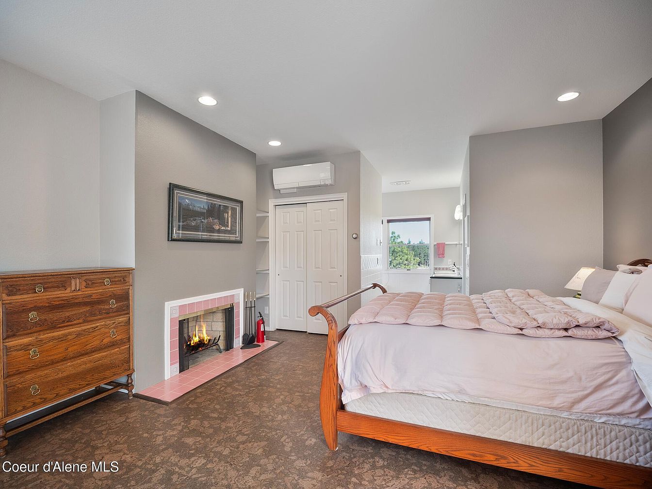 This spacious bedroom features a warm and inviting atmosphere with soft gray walls contrasted against the rich wooden frame of the bed and matching dresser. The bed is neatly made with light pink bedding, adding a gentle touch of color to the neutral setting. A functional white air conditioning unit is mounted above a closet with white paneled sliding doors, blending seamlessly into the overall decor. A charming fireplace with pink tile surrounds creates a cozy focal point, enhanced by a wall-mounted artwork above. The flooring is a textured brown, complementing the wood and muted tones. Recessed ceiling lights illuminate the space, while natural light streams in from a window near the adjoining bathroom area, visible through an open doorway, providing a sense of openness and flow.